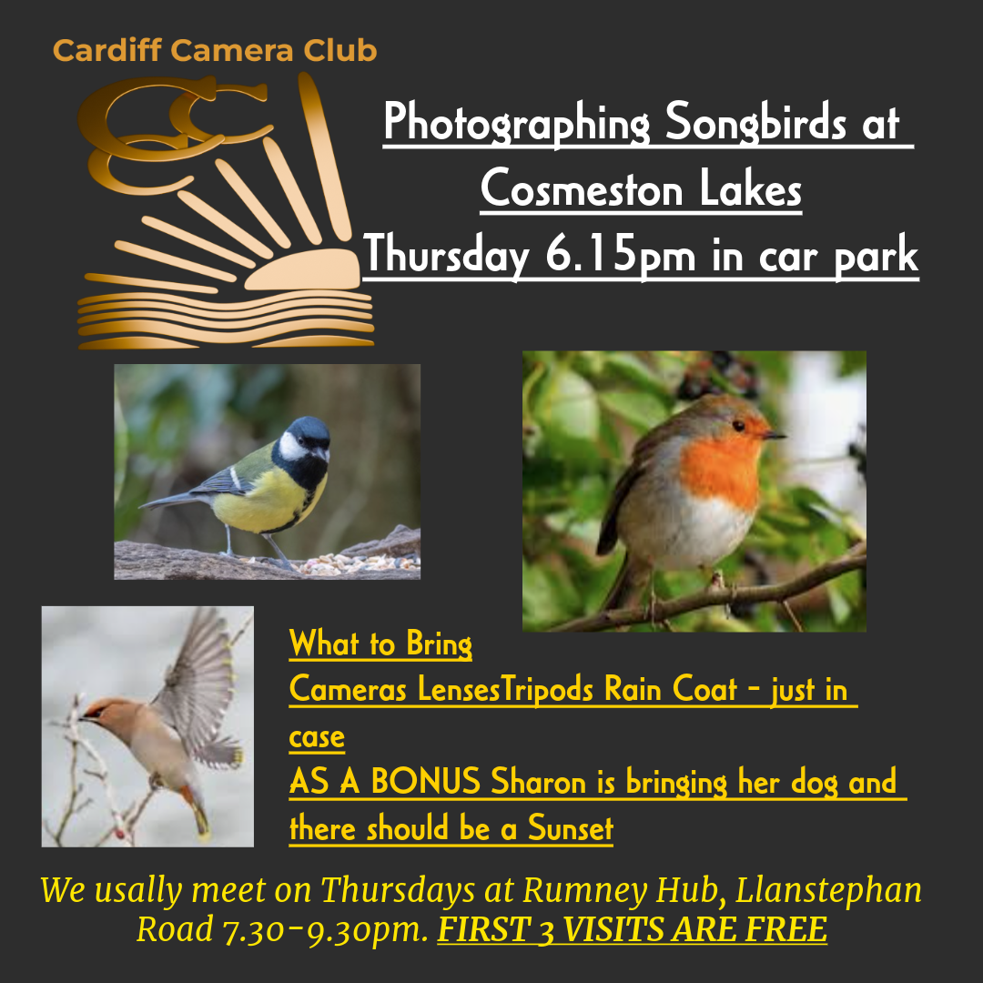 | 23/4/26 | Mobile Phone Challenge – Roath Park | Mobile Phone Challenge (not mandatory if you hate the idea of phone photography) Objectives ‘Less is More’ ‘Attention to Detail’. ‘Lake Light and Reflections’ | Meet by Lighthouse 6.30pm. 2 results emailed to Richard for website gallery and Facebook post. |